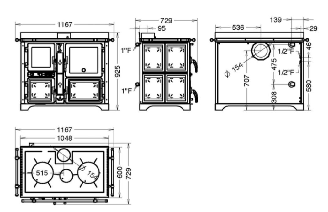 Spishällen är i stål med satinfinish (standard), vevhandtagsanordning för att lyfta eldstadsgrillen. Ugnsdörr med termometer, emaljerad stålugn, anordning för att justera ugnstemperaturen finns. Dörrar i gjutjärn.