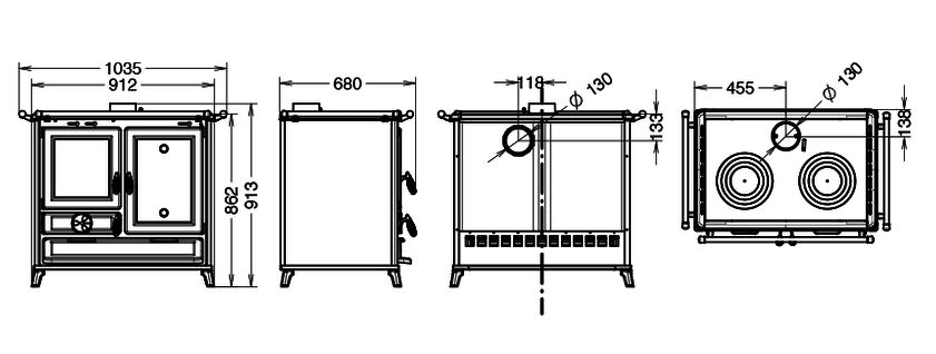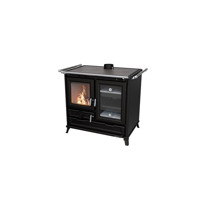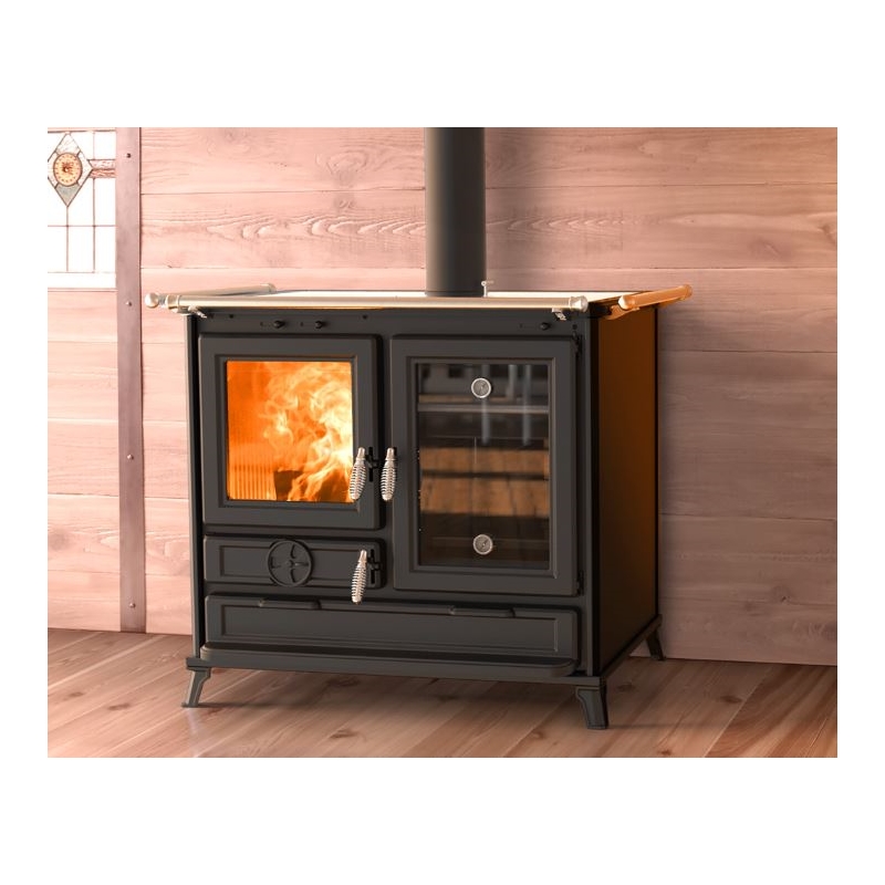 Vedeldad spis tillverkad i stål och gjutjärn, med stor värmeväxlande yta och lång rökgasväg för effektiv värmeöverföring.